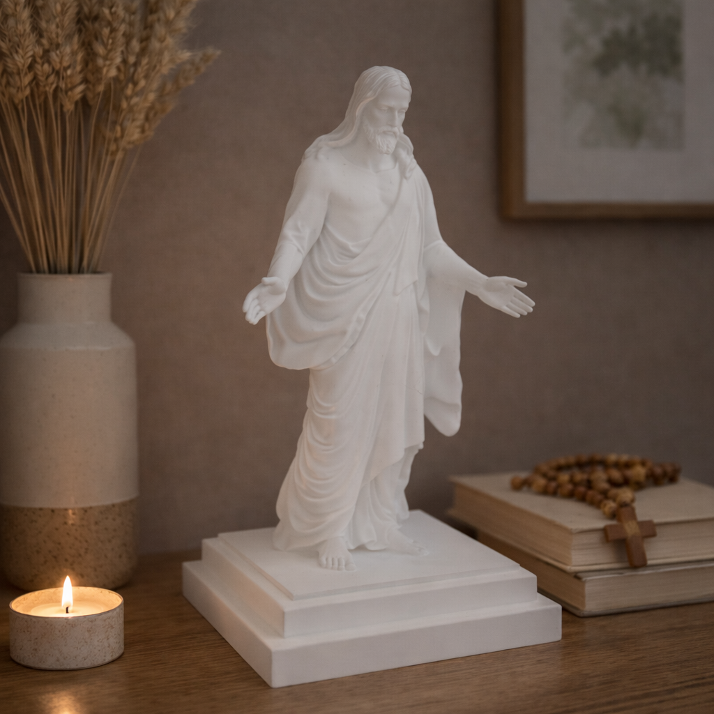 Estatuetas e símbolos religiosos em impressão 3D para fé, espiritualidade e decoração.