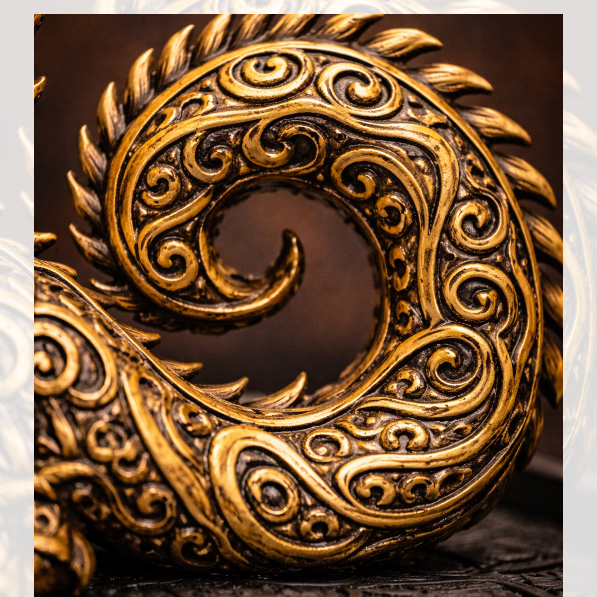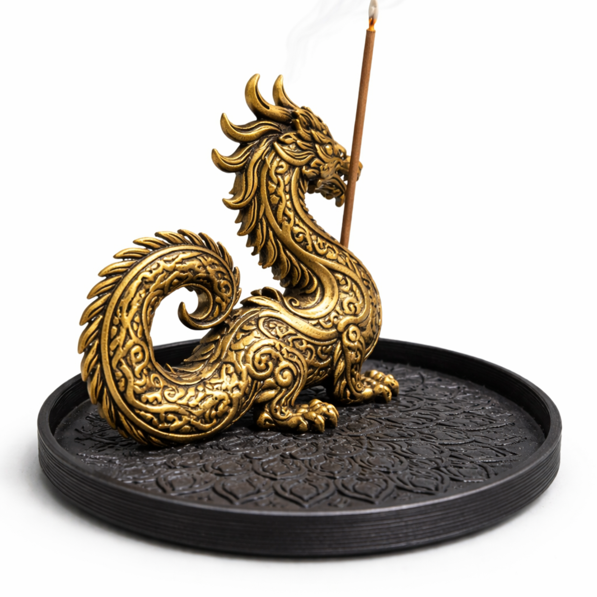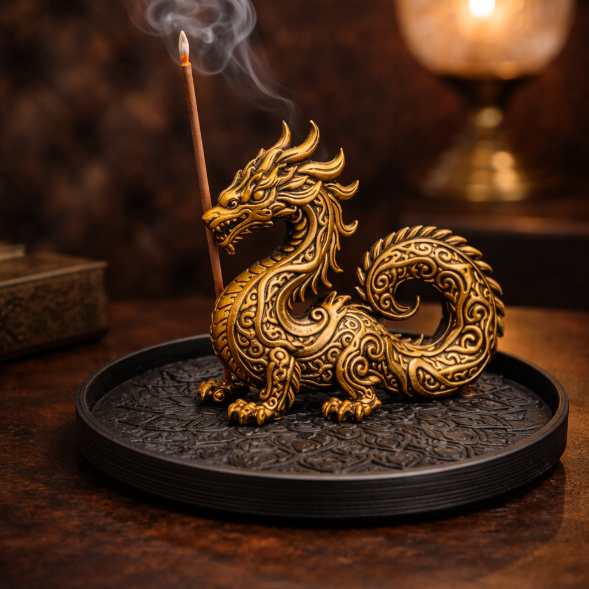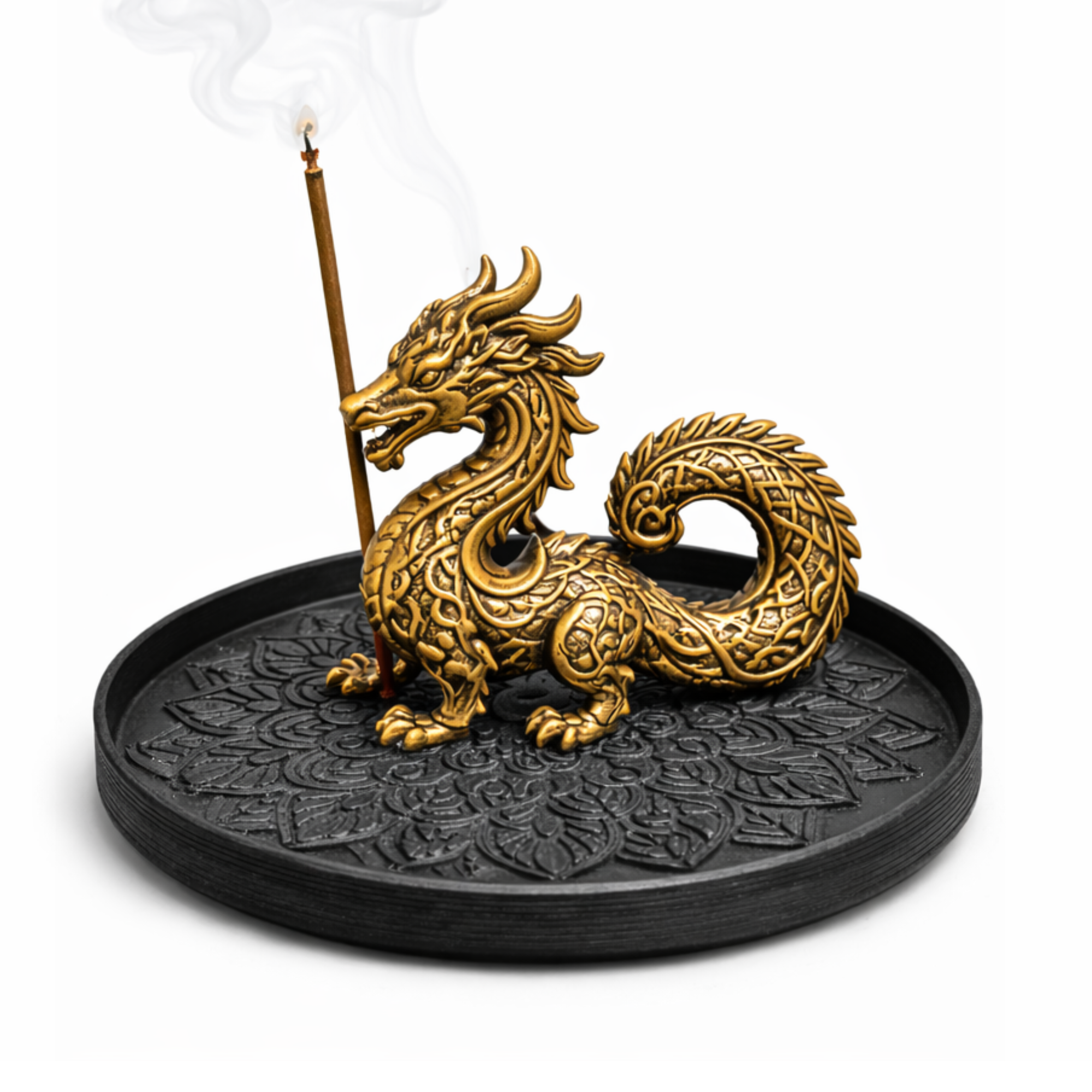 Incensário decorativo em formato de dragão oriental com acabamento dourado detalhado e base preta texturizada. Ideal para criar um ambiente místico, sofisticado e cheio de personalidade.