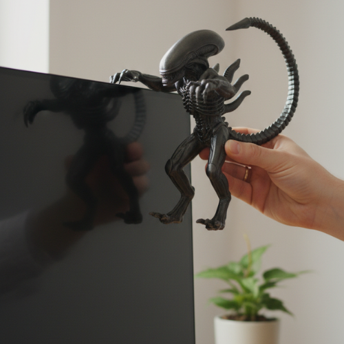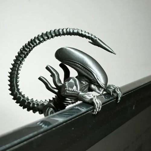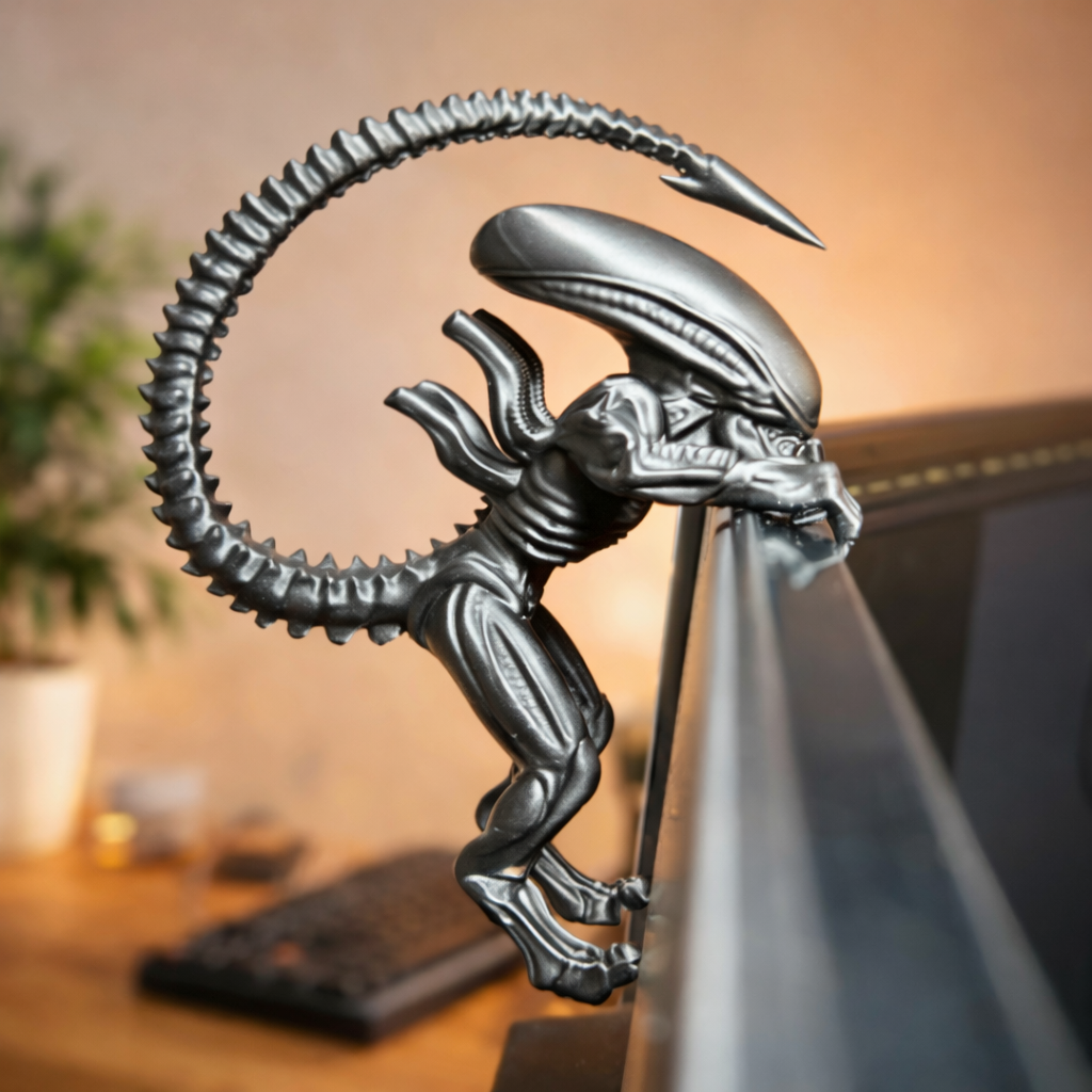 Suporte decorativo em formato de Alien Xenomorfo para encaixe em monitor ou tela. Design impactante no estilo sci-fi, ideal para setups gamer, escritórios criativos e fãs de cultura geek.